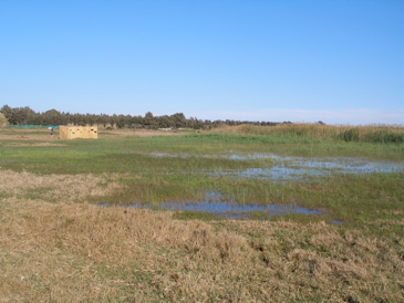 In March 2010, after an exceptionally wet winter, the areas in front of the reeds had reverted to this attractive-looking wet meadow but still not as impressive as the lake that used to form here - big enough to have lots of herons and wildfowl including breeding Ferruginous Duck. By July 2010 the whole area was dry again. The structure you can see is a hide made of reeds. You have to flush stuff to get to the hide but if you wait long enough birds might come back.