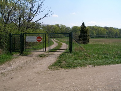 The no entry sign only refers to traffic - you are welcome to walk through the little gate towards the woodland beyond.