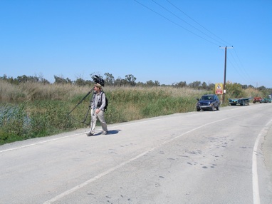 The road behind Ladies Mile Beach takes you along the eastern edge of Akrotiri salt lake, passing roadside pools that can be terrific for waders. Limassol is in the background. Behind the cyclists are the cranes of the port area next to Zakaki pool.