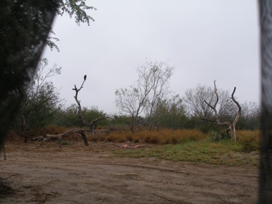 The view from inside one of the hides. The pink stuff on the far side of this track is entrails from an abbatoir. The bird on the snag is a Harris’s Hawk; Caracaras fed here too.
