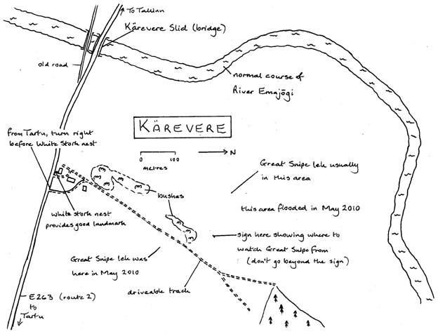 Here’s a map showing how to find the Great Snipe lek at Karevere - note that it may move according to the water levels.