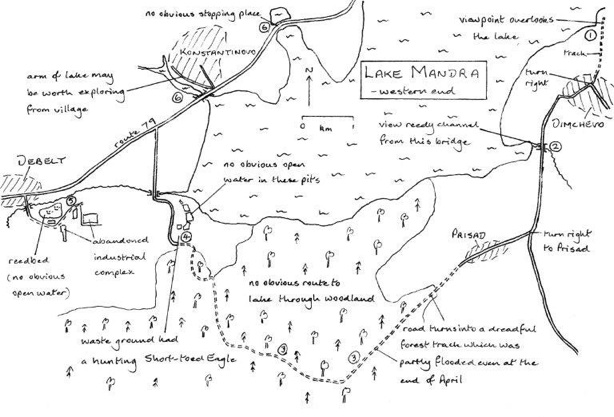 In his book, Birding in Eastern Europe, Gorman suggests that Lake Mandra is best explored by ‘seeking out small roads which run from Road 79 southwards to the water’s edge. One such road runs from the village of Debelt through woods to the lake’s southern shore’. This map and notes might be useful to anyone who tries to follow those directions. (The better parts of Lake Mandra are covered in my book Finding Birds in Eastern Bulgaria).
