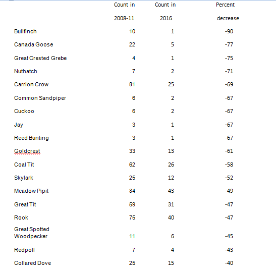 The figures for Coot, Pied Flycatcher, Swift, Redstart and Snipe are all based on a very small sample size and the 2016 count for House Martin is greatly boosted by one flock of 15 birds which has distorted the picture but the other species could well have increased since 2008-10 or at least been particularly numerous in 2016.