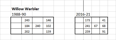 The 12 ‘squares’ in each grid are the 12 hectads (10 km squares) in the study area of the Sheffield Bird Study Group; the middle ‘numbered square’ shows where the city of Sheffield is. The number in each square represents the total number of Willow Warblers counted in 24 or 25 1-hour birdwatching walks in that area. Blank hectads were not studied. The map allows us to compare the numbers present in the last few years with what was counted in 1988-90. In this case, note the striking decline in numbers in the Sheffield ‘square’ and all three squares to the east.