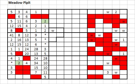 The number in each square indicates how many Meadow Pipits were counted in that tetrad in a 1-hour spring-time birdwatching walk during 2016-21. An * means it was recorded but not within the hour, a w means it was found during a 1-hour walk in winter. Red squares show where Meadow Pipits were not found in my 2016-21 surveys, even though they were present during the breeding birds survey of 2003-08; ie these are tetrads where Meadow Pipits may have disappeared since 2003-08 . Green squares show where they were found in 2016-21 but not in the 2003-08 survey. Note that in the breeding season I failed to find Meadow Pipits in almost all the tetrads to the east of Sheffield that had been occupied about 15 years earlier.