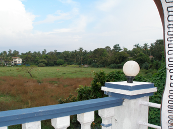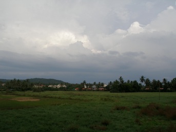 The view towards Arpora. Raptors, bee-eaters, munias, starlings, mynas and kingfishers perch on the wires. The skies reflect the fact that in 2010 the monsoon season continued well into November