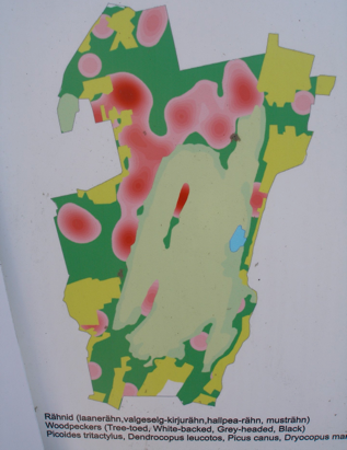 The island is the arrowed site on this map. It shows that it contains the highest density of woodpeckers in the area - and the area is one of the best in Europe for woodpeckers! La creme de la creme!